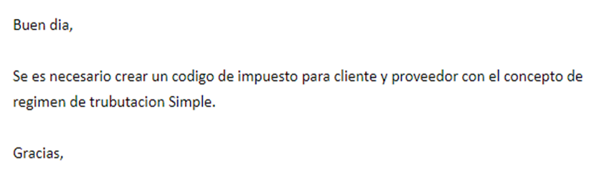 Por medio del aplicativo ‘Help Desk’ llega una solicitud que indica la creación de un código de impuesto para los clientes y proveedores.
