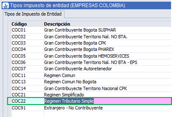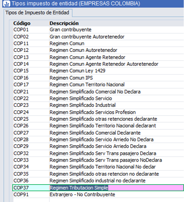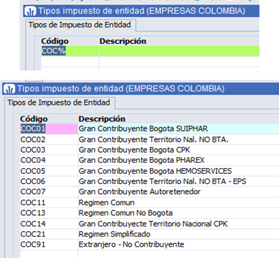 Se realiza el mismo procedimiento anterior, pero para ver el listado de impuestos de proveedores, se consulta por el campo ‘Código’ (COP%).